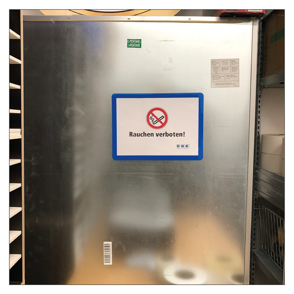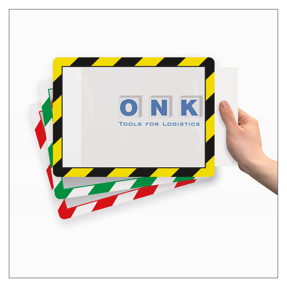 Magnetisch haftende Kennzeichnungsrahmen eignen sich hervorragend zur Aufnahme wichtiger Informationen wie Anweisungen, Gebote, Verbote, Warnhinweise und andere Kennzeichnungen in Betrieben, Schulen, Bibliotheken und Verkaufsräumen. Ein Kennzeichnungsrahmen besteht aus einem stabilen, transparenten PVC-Kunststoff und ist rückseitig mit einem umlaufenden Farbrahmen bedruckt, der dreiseitig mit magnetischen Streifen ausgerüstet ist. Eine Seite des Rahmens ist offen, so dass nach der Positionierung selbstgedruckte Dokumente leicht eingeschoben, aber auch jederzeit gewechselt werden können. Bedingt durch die Platzierung hinter der transparenten Folie des Kennzeichnungsrahmens, sind Ihre Informationen vor Verschmutzung geschützt, dennoch sehr gut lesbar. Unsere magnetisch haftende Kennzeichnungsrahmen sind in fünf Grundfarben und drei zweifarbigen Warnmarkierungen für eine ansprechende und dauerhafte Präsentation von Informationen jeglicher Art in diversen Formaten erhältlich. Die Verwendung der Kennzeichnungsrahmen ist sowohl im Hoch- als auch Querformat möglich.