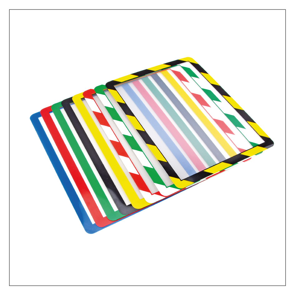Selbstklebende Kennzeichnungsrahmen eignen sich hervorragend zur Aufnahme wichtiger Informationen wie Anweisungen, Gebote, Verbote, Warnhinweise und andere Kennzeichnungen in Betrieben, Schulen, Bibliotheken und Verkaufsräumen. Ein Kennzeichnungsrahmen besteht aus einem stabilen, transparenten PVC-Kunststoff und ist rückseitig mit einem umlaufenden Farbrahmen bedruckt, der dreiseitig mit doppelseitigen Klebestreifen ausgerüstet ist. Eine Seite des Rahmens ist offen, so dass nach der Positionierung selbstgedruckte Dokumente leicht eingeschoben, aber auch jederzeit gewechselt werden können. Bedingt durch die Platzierung hinter der transparenten Folie des Kennzeichnungsrahmens, sind Ihre Informationen vor Verschmutzung geschützt, dennoch sehr gut lesbar. Unsere selbstklebenden Kennzeichnungsrahmen sind in fünf Grundfarben und drei zweifarbigen Warnmarkierungen für eine ansprechende und dauerhafte Präsentation von Informationen jeglicher Art in diversen Formaten erhältlich. Die Verwendung der Kennzeichnungsrahmen ist sowohl im Hoch- als auch Querformat möglich.