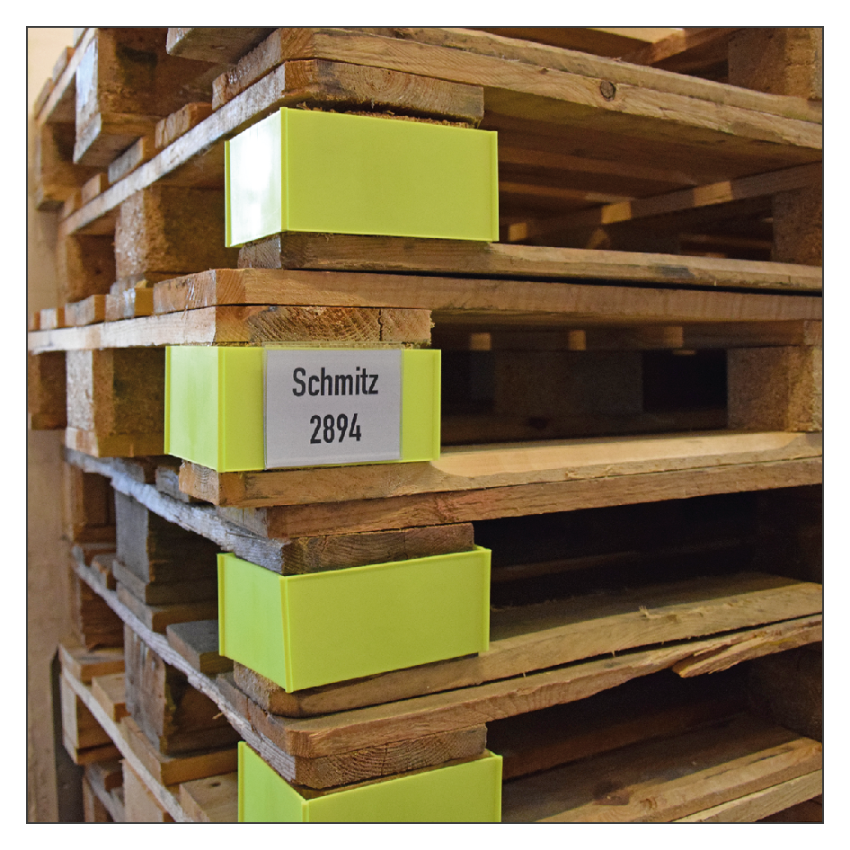 • Bei der Verwendung des Paletten-ID-Spange Eckfuß können Sie die Beschriftung auf zwei Seiten vornehmen, so dass diese Informationen sowohl von der Palettenschmallseite als auch der Palattenbreitseite wahrgenommen werden, sofern die gesamte Palettenecke sichtbar ist.