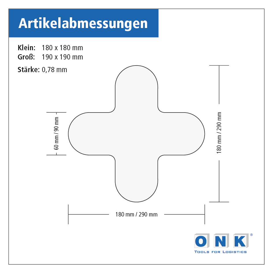 Selbstklebende Formstücke zur dauerhaften Bodenmarkierung dienen der deutlichen Kennzeichnung von Arbeitsbereichen, Lagerflächen und Transportwegen in Lagern, Parkhäusern, Werkstätten und anderen Bereichen. Unsere Formstücke sind in diversen Farb- und Formvarianten erhältlich, was Ihnen eine Fülle an Kombinationsmöglichkeiten für eine schlüssige und bedarfsgerechte Bodenkennzeichnung ermöglicht. T-Formstücke kommen z.B. bei der Kennzeichnung von Palettenstellplätzen oder als Trennelement für verschiedene Lagerbereiche zum Einsatz. Artikelausführung dieses T-Stücks:Material: Strapazierbare PVC-Hartfolie, Stärke 0,78 mm, rückseitig mit einem stark haftenden Kleber ausgerüstet Abmessungen: in zwei Größenvarianten erhältlichKleine Variante: 180 x 120 mm (Schenkelbreite 60 mm)Große Variante: 290 x 190 mm (Schenkelbreite 90 mm) Farbvarianten: erhältlich in gelb, weiß, blau, grün, orange, rot, schwarz und einer nachleuchtenden Ausführung Verpackungseinheiten: 20 Stück, nachleuchtende Ausführung 10 Stück Bitte beachten Sie: • Nachleuchtende Formstücke benötigen eine ständige „Lichtauftankung“, um bei einem Stromausfall grünlich zu leuchten. Die Zeitspanne dieses Leuchtens in der Dunkelheit ist von der Lichtintensität und Dauer der Gebäude- oder Raumbeleuchtung abhängig. Über einen längeren Zeitraum in der Dunkelheit nimmt der nachleuchtende Effekt stetig ab. • Sorgen Sie vor der Verklebung unserer Formstücke für eine optimale Bodenbeschaffenheit. Der Boden muß trocken sowie fett- und staubfrei sein, um eine dauerhafte Verklebung sicherzustellen. • Unsere Formstücke sind unabhängig ihrer Form in den Größen aufeinander abgestimmt. So können Sie beispielsweise alle Formstücke einer Größenvariante miteinander kombinieren und doch eine einheitlich aussehende Bodenmarkierung wahren. • Selbstklebende Bodenmarkierungen sind für eine dauerhafte Anwendung entwickelt, die Haftkraft des Klebers ist daher entsprechend stark und variiert auch je nach Bodenbeschaffenheit. Eine rückstandslose Entfernung kurz nach dem Verkleben ist je nach Bodenoberfläche eventuell möglich, kann jedoch nicht garantiert werden. Nach einer längeren Klebedauer ist eine rückstandslose Entfernung der Bodenmarkierung eher unwahrscheinlich. Eine bewährte Möglichkeit, eine möglichst rückstandslose Entfernung eventuell zu begünstigen, ist durch Wärmeeinwirkung gegeben. Aufkleber jeglicher Art bzw. der Kleber dieser Artikel verhalten sich nach dem Erwärmen (z.B. mit einem Fön) flexibler und lassen sich daher leichter ablösen. Dies kann aber ebenfalls nicht garantiert werden.