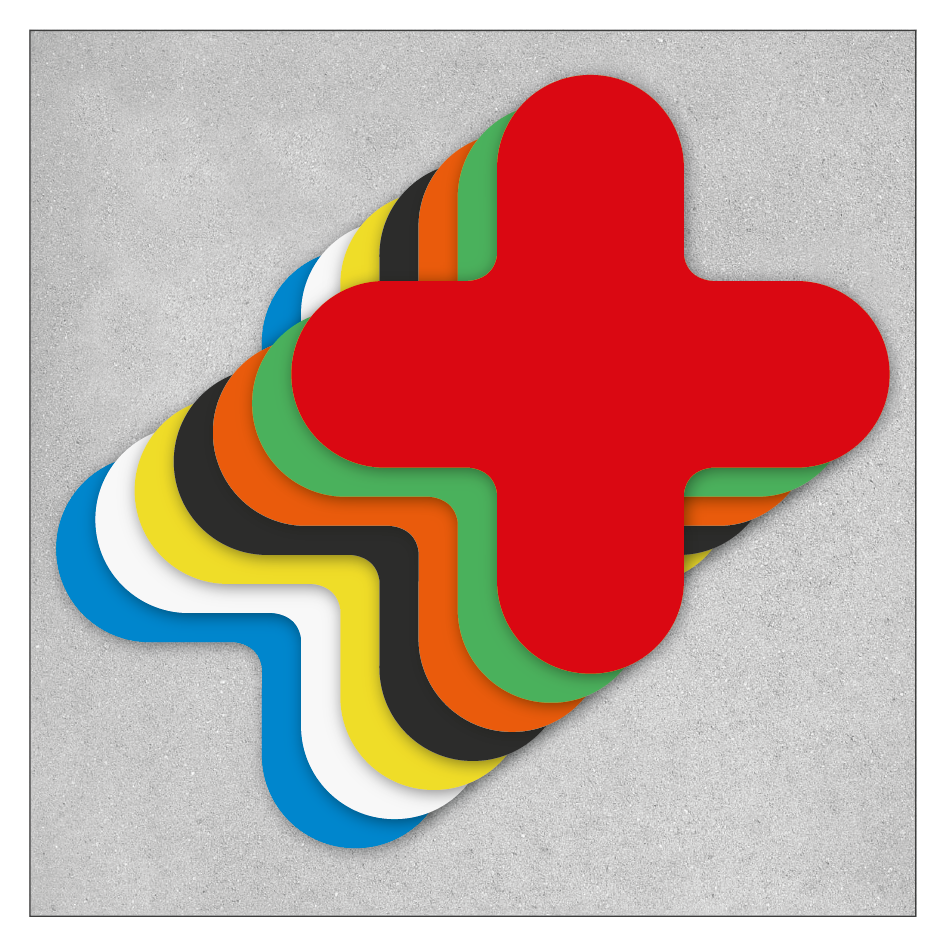 • Unsere Formstücke sind unabhängig ihrer Form in den Größen aufeinander abgestimmt. So können Sie beispielsweise alle Formstücke einer Größenvariante miteinander kombinieren und doch eine einheitlich aussehende Bodenmarkierung wahren.