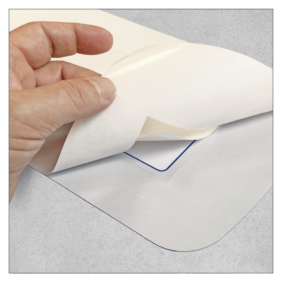 • Bei unseren Kennzeichnungsrahmen ist der Raum für die individuellen Inhalte im rückseitigen Schutzpapier, das den Kleber abdeckt, bereits perforiert. Bitte ziehen Sie zunächst das Schutzpapier in diesem Bereich ab. Legen Sie dann das Blatt Papier mit Ihren ausgedruckten Informationen seitenverkehrt auf die freie Klebefläche und streichen es glatt. Ziehen Sie erst dann das restliche Schutzpapier ab und verkleben Sie den Kennzeichnungsrahmen an der gewünschten Position.