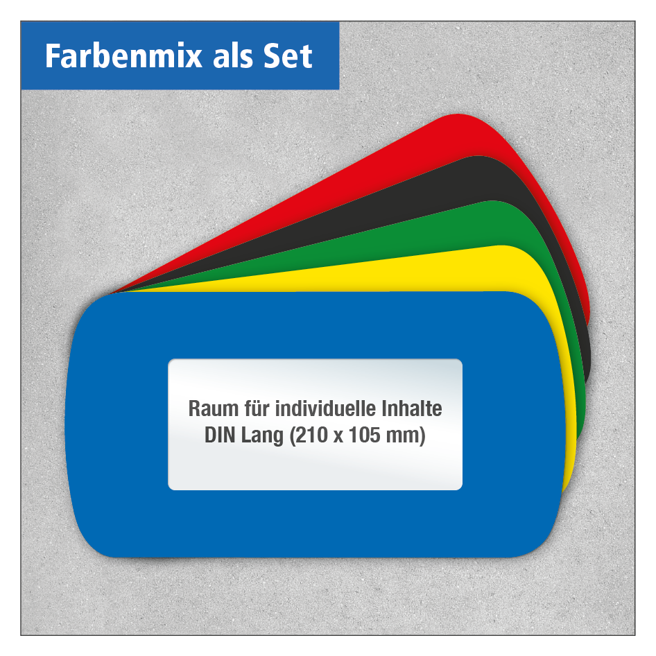 Verpackungseinheiten: zu 10 Stück, beim Farbenmix je 2 Stück in gelb, blau, rot, grün, schwarz