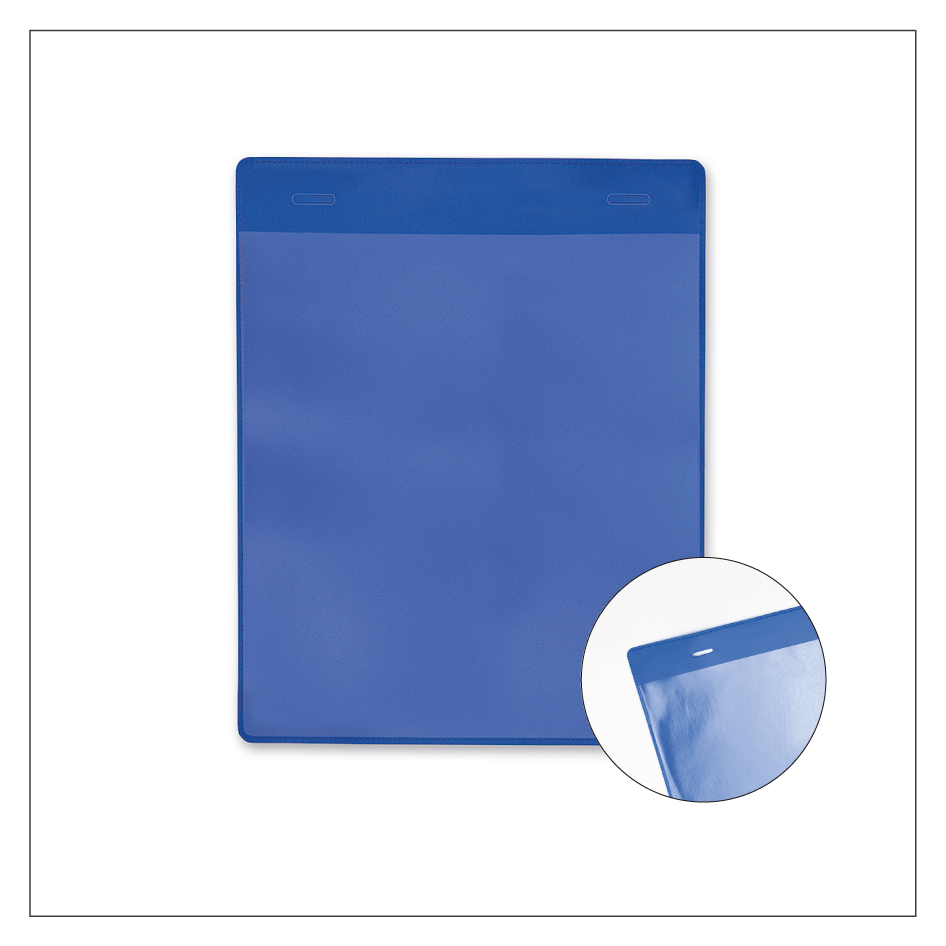 Diese blauen Einstecktaschen sind eine universelle Lösung, um Begleitpapiere einer Bestellung oder Artikelbeschreibungen im Lager- oder Verkaufsbereich an Drahtgitterboxen, Regaltraversen und Lagerbehältnissen jeglicher Art anzubringen. Die Einstecktaschen sind aus einer weichen PVC-Folie gefertigt, verfügen über eine transparente, scannertaugliche Frontfolie zum Schutz der eingeschobenen Dokumente und sind rückseitig mit verschiedenen Befestigungsmöglichkeiten ausgerüstet. Sie können wählen zwischen einer magnetischen, selbstklebenden oder drahtgebundenen Befestigung. Die Einstecktaschen sind dann je nach Wahl auf der Rückseite mit einem Magnetstreifen für eisenhaltige Untergründe oder einem selbstklebenden Klebestreifen für eine permanente Haftung ausgerüstet. Für die Befestigung mit Biegedrähten sind in der Oberseiten der Taschen ovale Längsschlitze vorperforiert, durch die Sie die lose beigelegten Drähte durchschieben können. Unsere Einstecktaschen sind in zwei Größen erhältlich, die Unterlagen in den DIN-Formaten A5 und A4 im Hoch- oder Querformat sicher aufnehmen können.