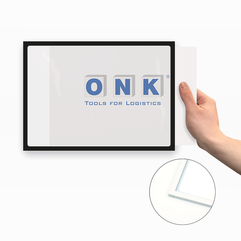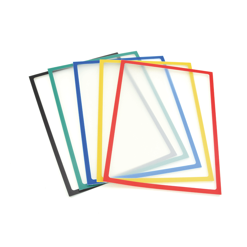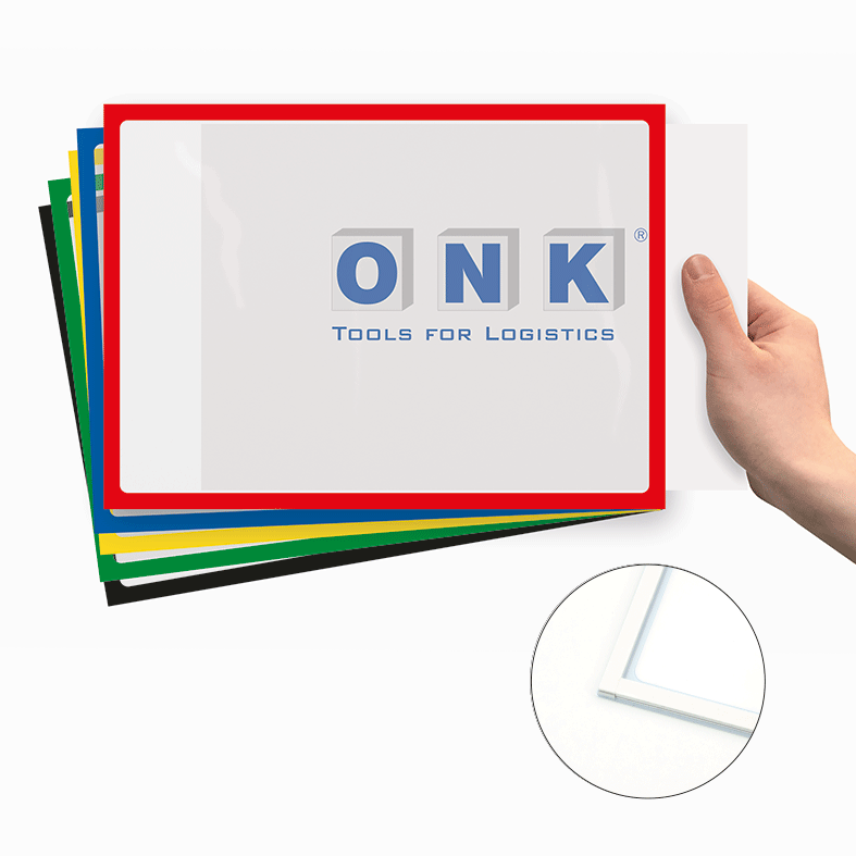 Magnetisch haftende Kennzeichnungsrahmen eignen sich hervorragend zur Aufnahme wichtiger Informationen wie Anweisungen, Gebote, Verbote, Warnhinweise und andere Kennzeichnungen in Betrieben, Schulen, Bibliotheken und Verkaufsräumen. Ein Kennzeichnungsrahmen besteht aus einem stabilen, transparenten PET-Kunststoff und ist rückseitig mit einem umlaufenden Farbrahmen bedruckt, der dreiseitig mit magnetischen Streifen ausgerüstet ist. Eine Seite des Rahmens ist offen, so dass nach der Positionierung selbstgedruckte Dokumente leicht eingeschoben, aber auch jederzeit gewechselt werden können. Bedingt durch die Platzierung hinter der transparenten Folie des Kennzeichnungsrahmens, sind Ihre Informationen vor Verschmutzung geschützt, dennoch sehr gut lesbar. Unsere magnetisch haftende Kennzeichnungsrahmen sind in fünf Grundfarben für eine ansprechende und dauerhafte Präsentation von Informationen jeglicher Art erhältlich. Die Verwendung der Kennzeichnungsrahmen ist sowohl im Hoch- als auch Querformat möglich. Merkmale der magnetisch haftenden Kennzeichnungsrahmen:Material: PET-Folie, transparent, 0,5 mm stark (ohne Magnetstreifen) Abmessungen: für DIN A4-Dokumente – 210 x 297 mm Farbausführungen: fünf Grundfarben (blau, gelb, rot, grün, schwarz) Ausführung: magnetisch haftend zur flexiblen Befestigung eingeschobenen Dokumente liegen geschützt hinter der Folie Verpackungseinheiten: 5 Stück der gewählten Farbausführung Bitte beachten Sie: Dokumente können jederzeit ausgewechselt werden. Selbstklebende Kennzeichnungsrahmen sind permanentklebend. Eine neue Plazierung ist ohne Beschädigung der Klebestreifen nicht möglich. Die Verwendung ist im Hoch- und Querformat möglich. Magnetische Kennzeichnungsrahmen haften auf allen eisenhaltigen Oberflächen. Sie haften nicht auf Materialien wie z.B. Aluminium.