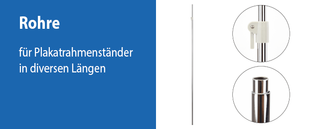 Das Teleskoprohr XXL ist hochwertig verchromt und besteht aus zwei ineinander geschobenen Stahlrohren, die sich mittels eines Feststellhebels auf die gewünschte Länge ausziehen und arretieren lassen. In Verbindung mit einer Fußplatte und einem aufgesteckten Plakatrahmen, sind Sie in der Lage, dieses Teleskoprohr bis zu 1.900 mm auszuziehen und so Artikelinformationen in einer hohen Position unübersehbar zu platzieren. Wir empfehlen, beim maximalen Auszug, die Verwendung einer schweren Fußplatte, um einen sicheren Stand zu gewährleisten. Für eine individuelle Zusammenstellung von Bodenplakatständern ist zu beachten, dass dieses Teleskoprohr nur für Fußplatten und Plakatrahmen mit einer Rohraufnahme von 12 mm geeignet ist. Merkmale dieses Teleskoprohres im XXL-Format:Material:  verchromtes Stahlrohr  grauer Kunststoff (Feststellhebel) Abmessungen:  Außenrohr ø 12 mm, Wandstärke ca. 1 mm  Innenrohr ø 10 mm, Wandstärke ca. 1 mm   Feststellhebel: 32 x 25 x 16 mm, fest installiert am Außenrohr    minimaler Auszug: 1.050 mm    maximaler Auszug: 1.900 mm  Ausführung:  ausziehbares Teleskoprohr mit einer Arretierungsfunktion      Verpackungseinheiten: 1 Teleskoprohr (zusammengeschoben)  Bitte beachten Sie: Dieses Teleskoprohr ist nur für Fußplatten / Bodenständer und Plakatrahmen mit 12 mm-Aufnahmen geeignet.  Dieses Teleskoprohr ist Bestandteil unserer Bodenplakatständer-Sets.  Passende Fußplatten und Plakatrahmen finden Sie in unserem Zubehörbereich.