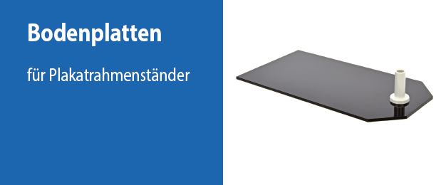 Diese Standard-Fußplatte ist für Plakatständer mit einer niedrigen bis mittelhohen Plakatrahmenposition konzipiert. Sie ist sowohl für unsere Standard-Teleskoprohre bis zu einer maximalen Auszugshöhe von 620 mm als auch für das Maxi-Stahlrohr 850 - 1.500 mm geeignet, wobei wir beim Maxi-Teleskoprohr empfehlen, die Auszugshöhe auf max. 1.200 mm zu begrenzen. Wird ein höherer Auszug der Teleskopstange gewünscht, sind für eine bessere Standfestigkeit unsere schweren Fußplatten geeigneter. Für eine individuelle Zusammenstellung von Bodenplakatständern ist zu beachten, dass dieser Standfuß nur Rohre mit einem Außendurchmesser von 12 mm aufnimmt. Wir bieten Teleskoprohre mit diesem Durchmesser und diversen Längen für eine individuelle Zusammenstellung an.  Merkmale der Fußplatte im Standard-Format für Plakatständer:Material:  schwarz pulverbeschichtetes Stahlblech, aufgenieteter Rohrhalter: blauer Hartkunststoff  Abmessungen:  160 x 180 mm, Stärke 1,5 mm, Rohrhalter: 40 mm hoch  Ausführung:  für Stangen mit einem 12 mm Außendurchmesser.   Verpackungseinheiten: eine Bodenplatte  Bitte beachten Sie: Der Standfuß Standard ist für die Verwendung von Teleskopstangen bis zu einer mittleren Höhe geeignet.