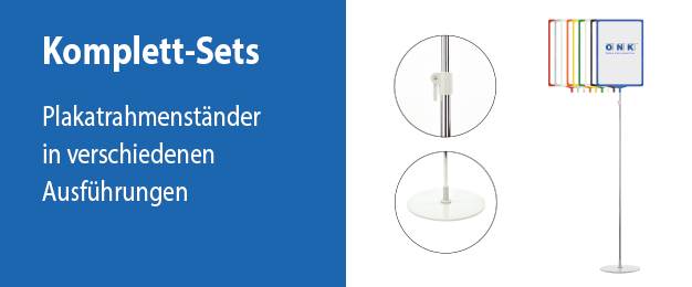Dieses Bodenplakatständer-Set ist als Informationsträger außerordentlich flexibel und wird gleichermaßen im Lager zur Stellplatzauszeichnung wie auch zur Verkaufsförderung in Publikumsbereichen oder zur Vermittlung wichtiger Informationen in Betrieben, Schulen, Bibliotheken und anderen Stätten verwendet. Das mehrteilige Ständer-Set überzeugt mit seiner stabilen und flexiblen Ausführung – die schwere Fußplatte garantiert einen sicheren Stand, das verchromte Teleskoprohr läßt sich bis zu einer Höhe von 1.900 mm ausziehen. Zusammen mit den Plakatrahmen, die in zwei Größen und diversen Farben erhältlich sind, ist eine individuelle und gut sichtbare Kennzeichnung leicht zu realisieren. Das Wechseln von Informationen ist zudem einfach und sehr schnell erledigt: ein handbeschriebenes oder ausgedrucktes Blatt Papier wird einfach in den Plakatrahmen eingeschoben. Die offene Bauweise der Plakatrahmen ermöglichen zudem eine beidseitige Sichtbarkeit der eingelegten Inhalte – es müssen lediglich zwei Papierblätter, Rücken an Rücken gelegt, im Rahmen platziert werden. Merkmale des Bodenplakatständer - Sets:Material:  Plakatrahmen und Rahmenhalter (T-Stück): farbiger Hartkunststoff  Ausziehbare Stange: verchromter Stahl, Stärke 12 mm, Auszugfeststellhebel: Kunststoff  Ständerfuß: massives, grau pulverbeschichtetes Metall, aufgeschraubter Rohrhalter: Hartkunststoff   Abmessungen:  Plakatrahmen DIN A4: Außenformat  220 x 310 x 11 mm - für Inhalte im Format DIN A4  Plakatrahmen DIN A3: Außenformat  310 x 430 x 11 mm - für Inhalte im Format DIN A3  Plakatrahmenhalter: 90 x 50 x 16 mm   Ständerfuß: schwere Ausführung, rund, ø 255 mm, Stärke 5 mm, Rohrhalter: 50 mm hoch  Teleskopstange: eingezogen ca. 1.050 mm, ausgezogen ca. 1.900 mm  Ausführung:  Der Aufbau des Palettenständers basiert auf einem Steck- und Klicksystem. Werkzeug zum Zusammenbauen ist daher nicht erforderlich.  Verpackungseinheiten: Das Palettenständer-Set wird in Einzelteilen wie folgt geliefert: mit einem runden Ständerfuß, einem Plakatrahmen, einem Plakatrahmenhalter (T-Stück), einer verchromte Teleskopstange   Bitte beachten Sie: Die transparente PVC-Dokumententasche (U-Tasche), wie in manchen Darstellungen abgebildet, ist nicht Bestandteil des Sets. Diese U-Tasche muss separat erworben werden . Zur U-Tasche.  Für eine optimale beidseitige Sichtbarkeit sollten zwei Blätter eingeschoben werden. Ein beidseitig bedrucktes Blatt kann zwar ebenfalls benutzt werden, jedoch scheinen die Motive auf den anderen Seiten durch, so dass die Lesbarkeit nicht optimal ist. Dies kann jedoch durch die Verwendung eines stärkeren Kartons minimiert werden. Bei Gegenlicht ist hingegen eine Blickdichtigkeit erforderlich, die nur erreicht wird, wenn zwischen zwei Blättern ein schwarzer Karton oder eine schwarze Folie in gleicher Papiergröße eingelegt wird.  Die Teile dieses Ständer-Sets können als Ersatz oder zur Erweiterung auch einzeln erworben werden.