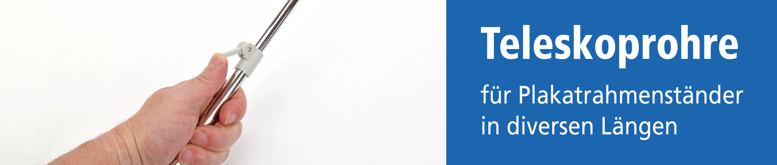 Für unsere Plakatrahmenständer führen wir hochwertig verchromte Teleskoprohre mit verschieden Längen und Auszugsmaßen. Wählen Sie die passende Ausführung für Ihren Einsatzzweck. Die Teleskoprohre bestehen aus zwei ineinander geschobenen Stahlrohren, die sich innerhalb der vorgesehenen Auszugsmaße auf die gewünschte Länge ausziehen und mittels eines Feststellhebels arretieren lassen. Bei unserem Standard-Teleskoprohr erfolgt die Arretierung mittel einem Kunststoffstopfens.