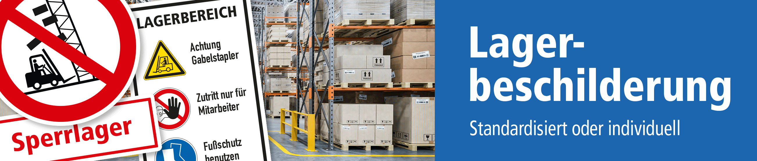 In der Kategorie Lagerbeschilderung führen wir eine Reihe allgemein gebräuchlicher Schilder für Lager- und Versandbereiche, die jeweils als Standardartikel oder mit Ihren Textinhalten individualisiert erhältlich sind. Die Themenbereiche reichen von Warnschildern, z.B., Nicht mit dem Gabelstapler gegen Regale fahren, über Schilder zur Lagerzugangsberechtigung bis hin zur Sicherheitskennzeichnung in vielfältiger Form wie Sicherheitsschilder, genormte Verbots- und Warnhinweise sowie Verkehrsschilder nach StVO oder in praxisbewährten Ausführungen.
