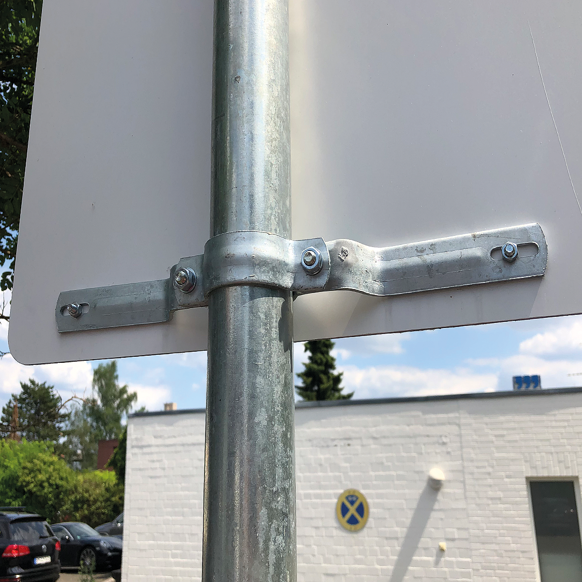 Bitte beachten Sie unsere Hinweise zur Schellengrößen und sicheren Schilderbefestigung (weiter unten). Rohrschellen nach der IVZ-Norm stellen die Standardbefestigungen für Schilder und Verkehrszeichen dar. Sie sind in diversen Längen erhältlich, außerordentlich stabil und somit für dauerhafte Befestigungen von Aluminiumschildern bestens geeignet. Für eine sichere Befestigung von Schildern mit einer Höhe über 200 mm werden zwei Rohrschellen benötigt. Merkmale dieser Rohrschelle zur Schilderbefestigung: Norm: nach IVZ Material: Stahl, feuerverzinkt Ausführung: zweiteilig zum Verschrauben Schellenlänge: ca. 755 mm Lochung zur Schilderbefestigung: Lochabstand 700 mm Verpackungseinheiten: 1 Rohrschelle, 2 Schrauben und 2 Muttern zur Befestigung am Pfosten Bitte beachten Sie: Für eine sichere Befestigung von Schildern mit einer Höhe über 200 mm werden zwei Rohrschellen benötigt. Bei der Wahl der Befestigung mittels Rohrschellen an einem Rohrpfosten sollte die Gesamtlänge der Rohrschellen stets kleiner sein, als die horizontale Schilderbreite, damit die Rohrschellen nicht als unschöner/unnötiger Überstand links und rechts des Schildes herausragen. Bitte ermitteln Sie vor dem Erwerb von Befestigungsschellen erst den Durchmesser des Pfostens, an dem die Schelle angebracht werden soll. Der Durchmesser der benötigten Schellen sollte mit dem Durchmesser des Pfostens übereinstimmen. Schrauben und Muttern zur Schilderbefestigung liegen den Schellen nicht bei – diese sind Zubehör und müssen separat erworben werden – siehe Zubehör. Diese Rohrschelle ist nicht zur Befestigung von Schildern aus PVC-Hartschaum oder ähnlichen Materialien geeignet. Diese Materialien sind zu weich und könnten beim Anziehen der Schrauben/Muttern beschädigt werden bzw. brechen. Nutzen Sie daher diese Rohrschellen nur in Verbindung mit 2 mm Aluminiumschildern oder ähnlich harten Schildermaterialien.