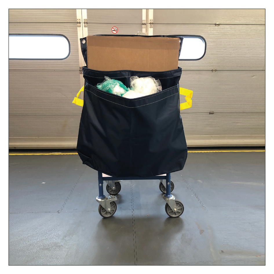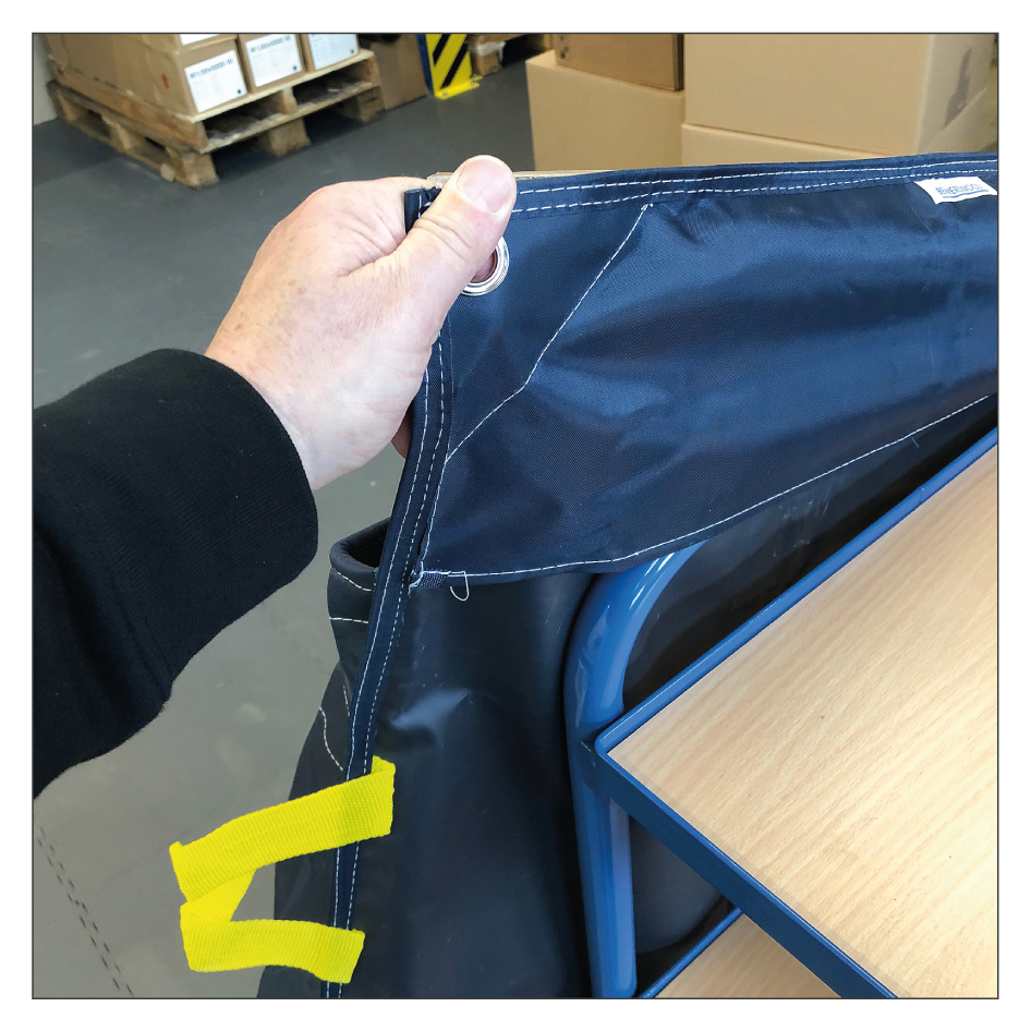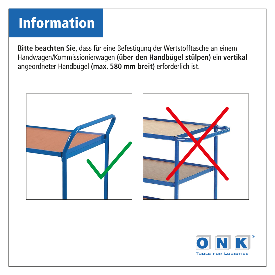 - Der Handbügel des Kommissionierwagens darf max. 580 mm breit sein, sofern die Tasche zur Befestigung darüber gestülpt werden soll.