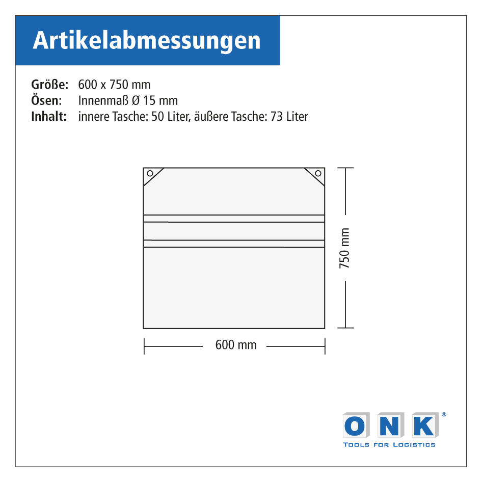 - Innere Tasche: 600 x 560 mm, Inhaltsvolumen: 50 Liter